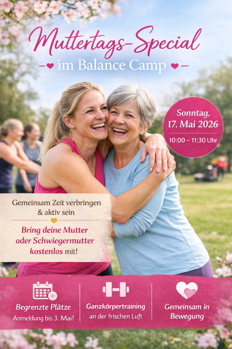 Wichtiger Hinweis zur Teilnahme: Für eine einmalige Teilnahme am Balance Camp ist kein Anamnesebogen erforderlich. Mit der Teilnahme bestätigst du, dass du dich gesundheitlich in der Lage fühlst, an einem funktionellen Training teilzunehmen. Solltest du gesundheitliche Einschränkungen oder Beschwerden haben, kläre bitte vorab mit einer Ärztin oder einem Arzt ab, ob eine Teilnahme für dich geeignet ist.
